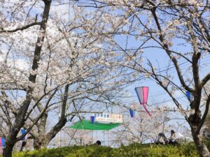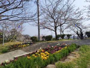 満開まではもう少しです。花壇のチューリップなども咲いています。
